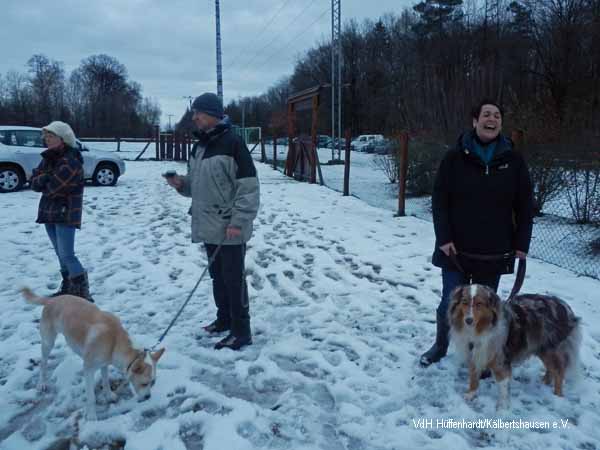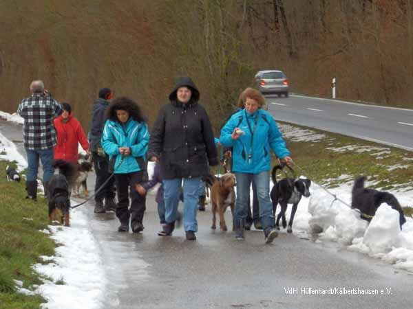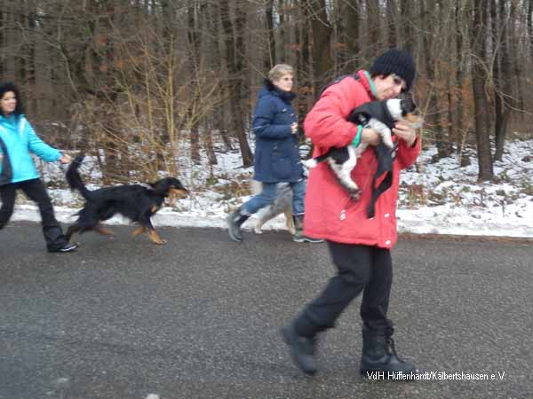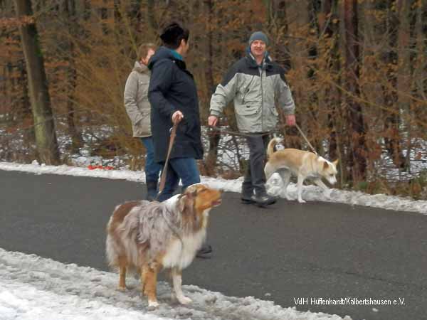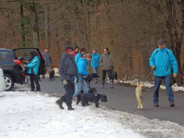 Zuerst machen sich alle Hundeführer/innen mit ihren vierbeinigen Gefährten, trotz der Kälte und des Schnees, zu einer Wanderung auf.